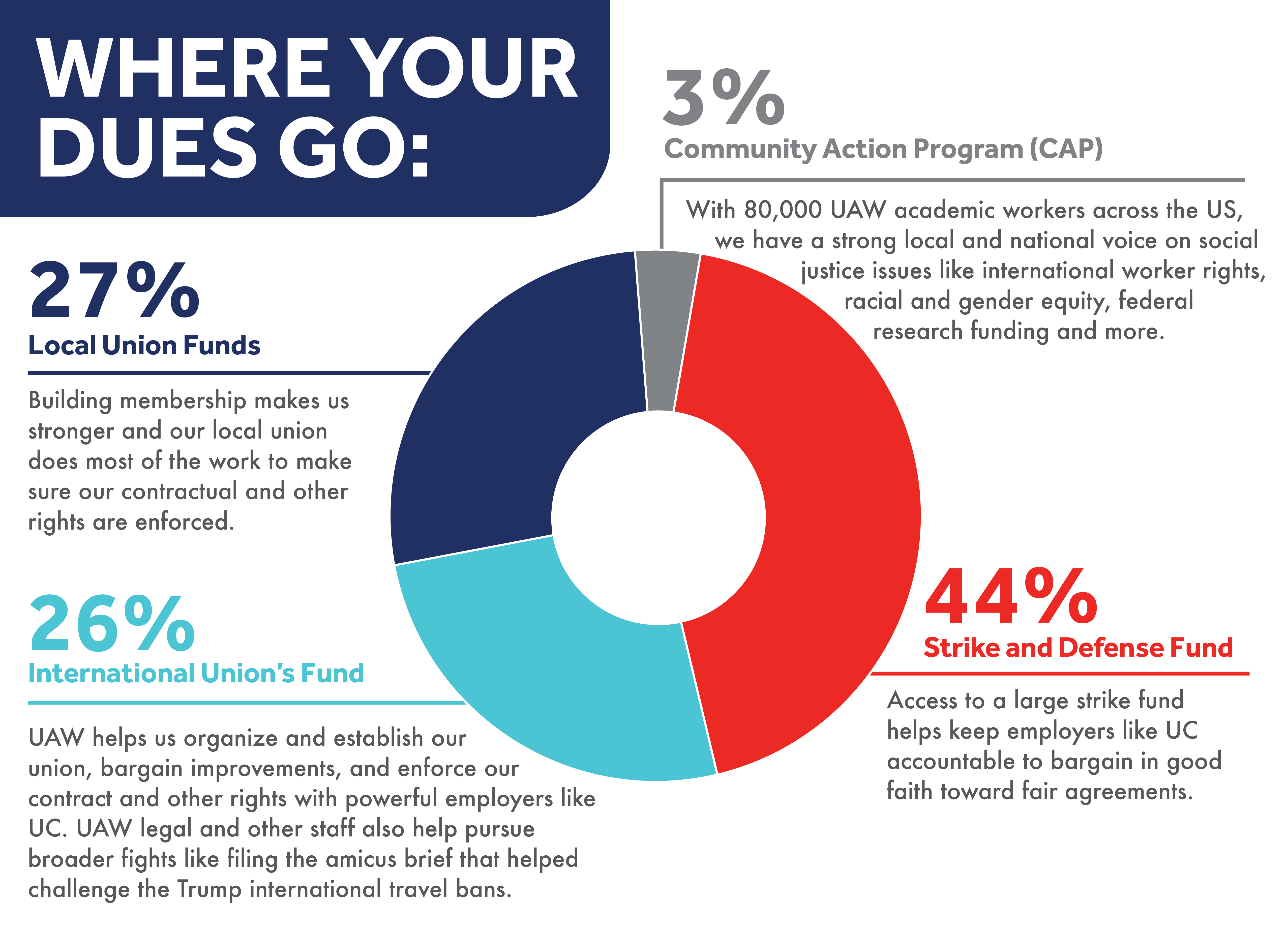 Most of the work of enforcing the contract and representing membership is financially supported by the Local Union. 27% of the dues are allocated to the Local to support its expenses. An additional 26% of dues goes to the International Union’s General Fund, which provides technical support for contract negotiations and contract enforcement, and also supports new organizing campaigns. The rest of the dues are allocated to the Strike and Defense Fund (44%), and Community Action Program (CAP (3%). A more detailed description of how Postdocs and Academic Researchers are supported by these funds is below. Depending on the overall financial health of the Strike and Defense Fund (if the balance is $500M or greater), an additional allocation of dues called a “rebate” is given back to the Local and International Union. So, in typical months, the Local 5810 portion of dues is roughly 37%.